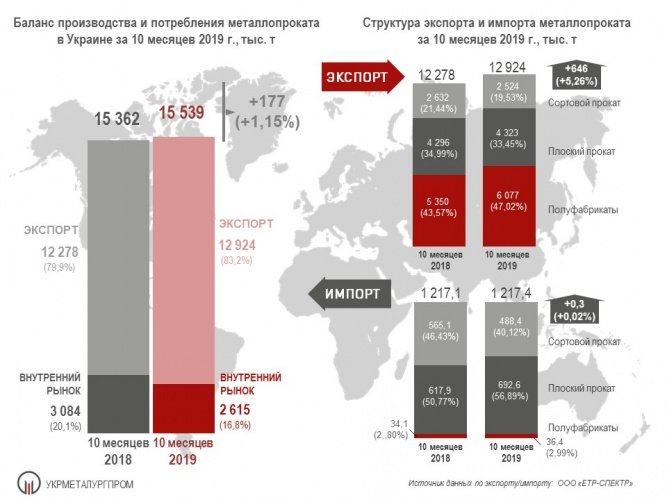 According to the Association, in January – October 2019 Ukrainian metallurgical enterprises produced 15,54 million tons of rolled steel, which is 1.2% more compared to the same period in 2018, of which, according to OOO "ETR-Spectrum", the exported order of 12.92 million tons, or 83.2 per cent. In the same period in 2018 the share of exports was 79.9% or 12,28 million tons with the total production of rolled metal of 15.36 million tons.