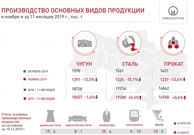as of December 10, 2019, from the current major production facilities are in operation: 15 of the 21 blast furnaces (70%), 8 of the 9 open hearth furnaces (90%), 10 of the 16 converters (60%), 5 of the 15 furnaces (30%) and 15 out of 15 machines for continuous casting of workpieces (100%).