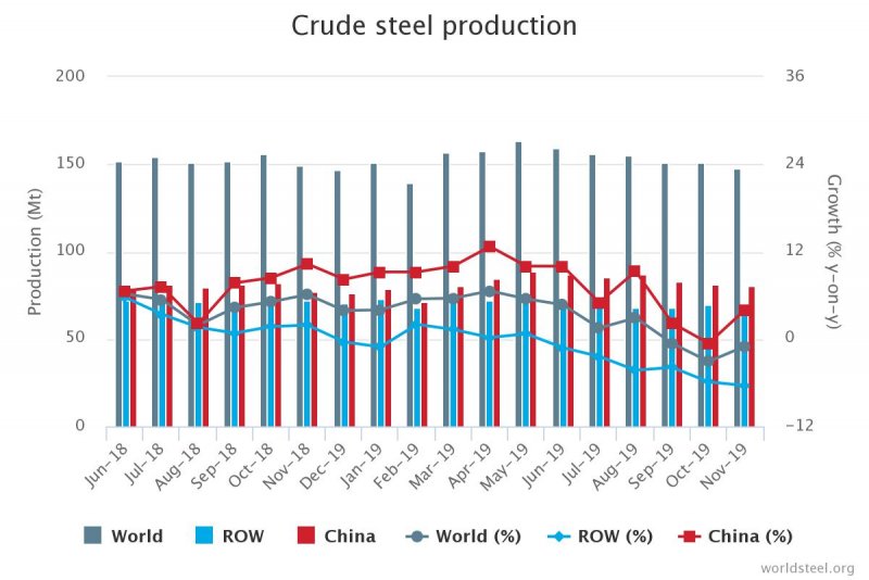 steel output in China in November 2019 was 80.3 million tons, an increase of 4.0% compared to November 2018. India produces 8.9 million tons of steel in November 2019, which is 2.8% less than in November 2018. Japan produced 7.7 million tonnes of crude steel in November 2019, which is 10.6% less compared to November 2018. Steel production in South Korea in November 2019 was 5.9 million tons, which is 0.5% less than in November 2018.