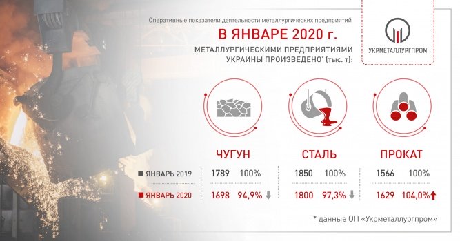 At pre data of Enterprises "Ukrmetallurgprom", in January 2020, the Ukrainian metallurgical enterprises produced of 1.80 million tons of steel, which is 13.3% higher than in December 2019, but 2.7% less than in January 2019. The production of iron increased in comparison with the previous month by 5.5%, but decreased year-on-year by 5.1%, to 1.70 million tonnes, while production of rolled products increased compared with December by 12.5% and 4% compared to January 2018 to 1.63 million tons.
