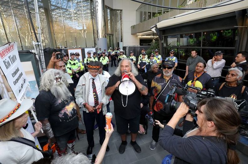 hundreds of people gathered outside the headquarters of Rio Tinto in Perth to protest against the destruction of ancient heritage.