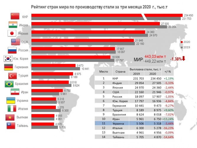Всего за первые три месяца 2020 года в мире было выплавлено 443 миллиона тонн стали, что на 1,4% меньше, чем в первом квартале прошлого года. В марте падение мирового производства стали ускорилось до 6% снизившись до 147,1 миллиона тонн. Глобальное производство чугуна в первом квартале 2020 года составило 333,68 миллиона тонн, что на 0,33% меньше чем в аналогичном периоде прошлого года.