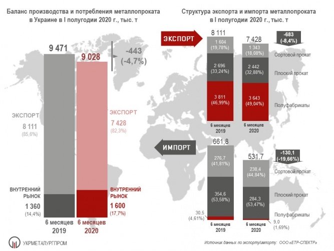 За 6 месяцев 2020 года украинскими металлургическими предприятиями произведено 9 030 тыс. тонн металлопроката (95,3% относительно аналогичного периода 2019 года), из которых, по информации ООО «ЕТР-Спектр», экспортировано порядка 7 430 тыс. тонн, или 82,3%. В аналогичном периоде 2019 года доля экспорта составляла около 85,6% (8 110 тыс. тонн при общем производстве металлопроката 9 470 тыс. тонн).