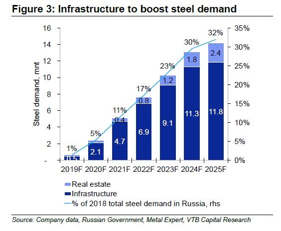 По данным ВТБ Капитал, прямое влияние на рынок стали окажут инфраструктурные проекты стоимостью 170 миллиардов долларов, а дополнительный эффект окажут поддержка промышленного экспорта и строительство недвижимости. В прогнозе указано, что благодаря этому спрос на сталь в РФ будет расти на 5 процентов с 2019 года, а к 2025 году увеличится на 14 миллионов тонн в год.