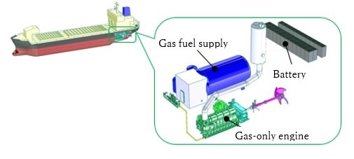 Силовая установка и бортовая электроэнергия во время плавания генерируются только газовым двигателем, разработанным Kawasaki Heavy Industries. Для создания большей мощности, дальнего и длительного плавания будет использоваться только природный газ. Мощность силовой установки и бортовая мощность во время входа, выхода и стоянки судна в порту будет обеспечиваться от батареи для обеспечения работы двигателя с нулевым уровнем выбросов.