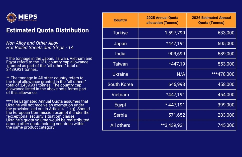 На диаграмме Европарламента, озаглавленной "Предполагаемое распределение квот" в карусели изображений выше, представлено наше предполагаемое распределение квот для крупнейшей категории продукции – горячекатаных листов и полос из нелегированных и других сплавов категории 1А.