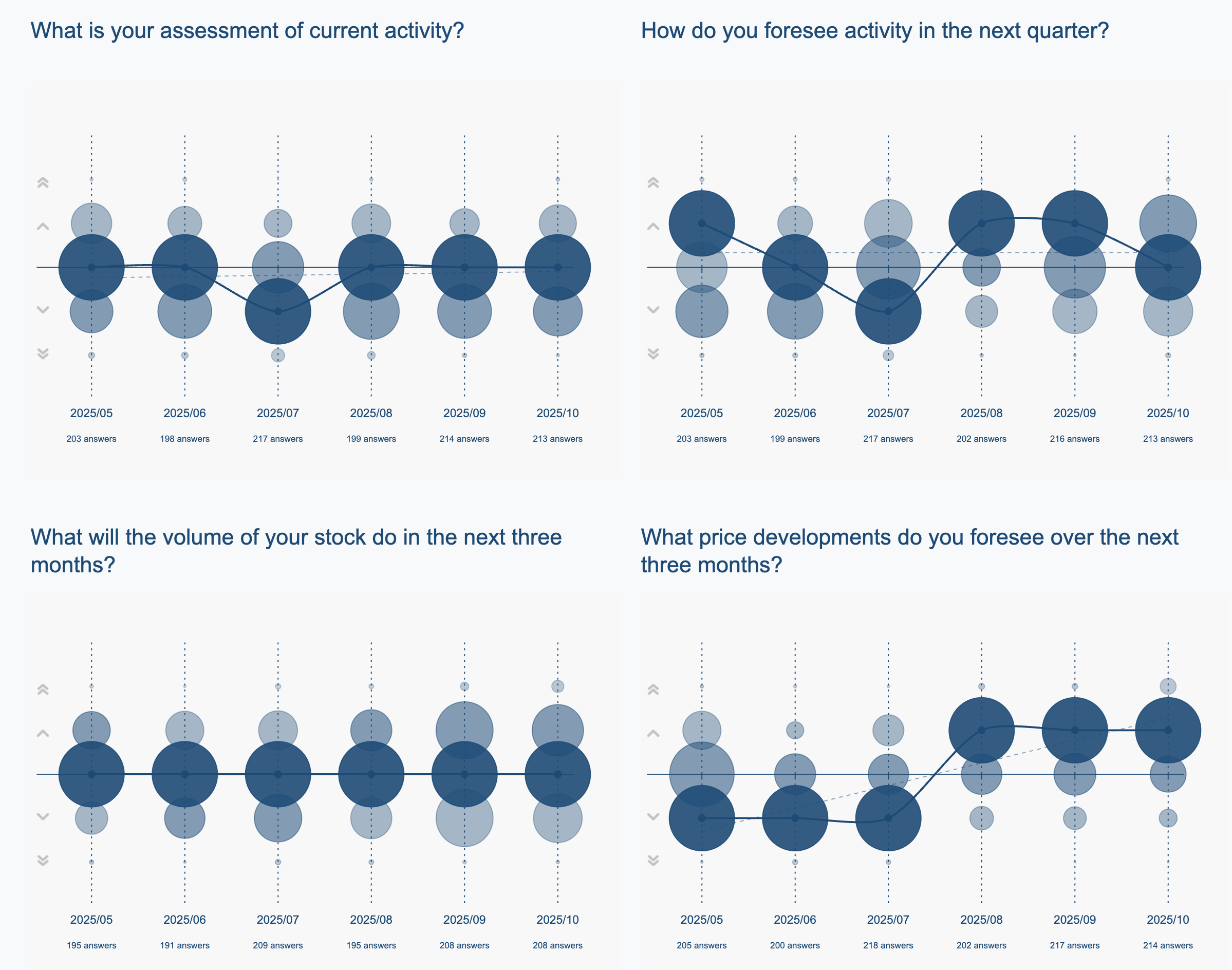 Хотя ценовые настроения еще не являются однозначно оптимистичными, тенденция указывает на то, что все больше респондентов начинают ожидать умеренного роста цен в ближайшие месяцы. Этот сдвиг может отражать признаки сокращения предложения, стабилизации спроса или ожидания циклов пополнения запасов в четвертом квартале.