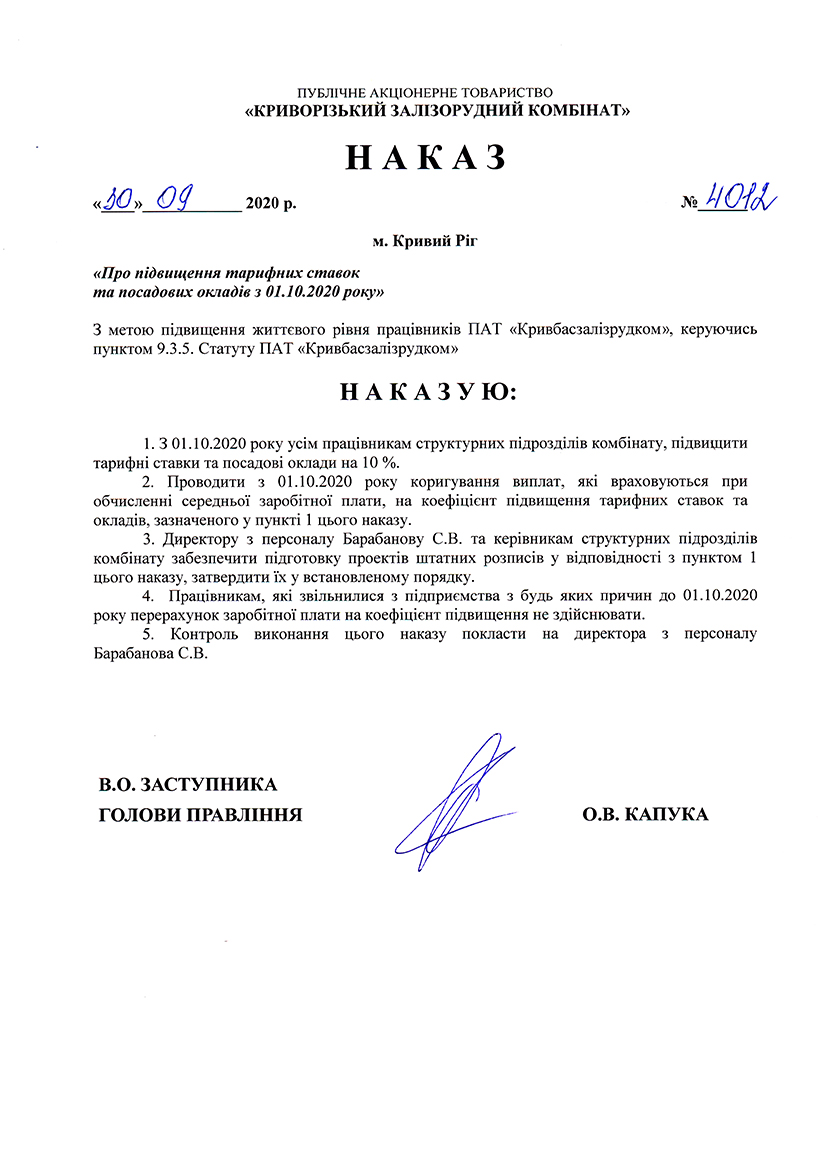 Администрация ПАО «Криворожский железорудный комбинат» сообщила о повышении тарифных ставок и должностных окладов работникам на 10% с 1 октября.