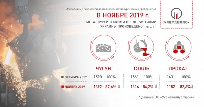 По предварительным данным ОП «Укрметаллургпром», в ноябре 2019 года металлургическими предприятиями Украины было выплавлено 1,31 миллиона тонн стали, что на 15,8% меньше, чем в октябре. За 11 месяцев 2019 года в Украине было выплавлено 19,28 миллиона тонн стали, что соответствует уровняю аналогичного периода прошлого года.