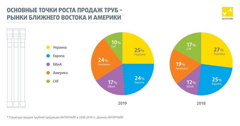 Европейским клиентам ИНТЕРПАЙП поставил 146 тыс. т бесшовных и сварных труб (-16% к 2018 году). Снижение продаж связано, главным образом, с введением Еврокомиссией импортных квот, в которых не были учтены мощности нового СП Vallourec Niko Tube.