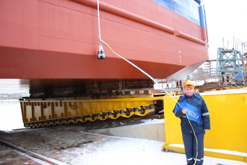 Крестной матерью нового судна стала крановщица транспортно-логистического участка Елена Ильюшкина. По давней традиции под аплодисменты судостроителей она разбила о борт символические бутылки шампанского, и директор завода Владимир Жмур дал команду на старт спуска судна. За 15 минут мощное спусковое устройство переместило заказ на воду, после чего буксиры перевели его в достроечный пирс, где стартовали заключительные работы и испытания механизмов.