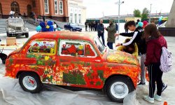 В конце праздника малыши вместе с родителями раскрасили в яркие цвета настоящий Запорожец, превратив машину в арт-объект.