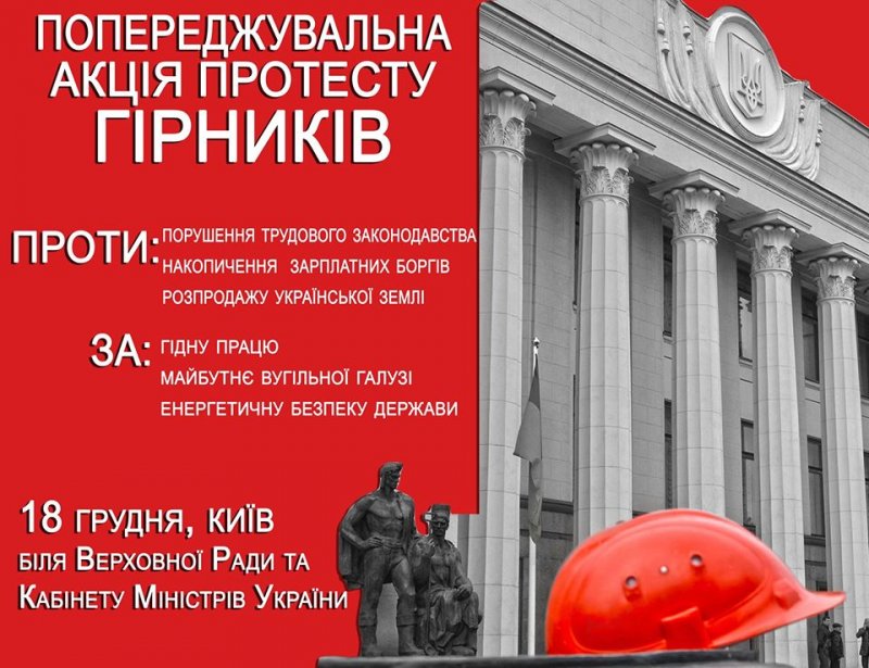 18 грудня біля будівель Верховної Ради і Кабінету міністрів України в Києві відбудеться попереджувальна акція протесту гірників і шахтарських сімей, членів незалежних профспілок. Про це повідомив голова Незалежної профспілки гірників України Михайло Волинець.