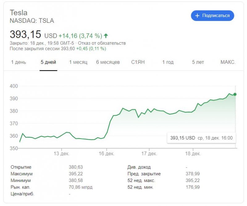 Акції Tesla (TSLA) в ході торгів на американській біржі NASDAQ, що спеціалізується на акціях високотехнологічних компаній, досягли нового рекордного максимуму, закрившись на рівні 393 долара за акцію в середу.